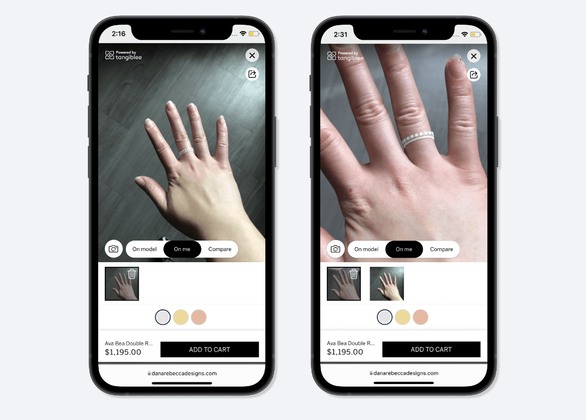 “We want customers to come to our site and be able to get everything they need to feel confident in their purchase,” remarked Blair Peterson, VP of Strategy at Dana Rebecca Designs. “In order to increase conversions and RPV for our business we needed a solution to take our website to the next level. We were trying to solve for ‘How can customers understand how the piece will look on them if they can’t touch it?’.”