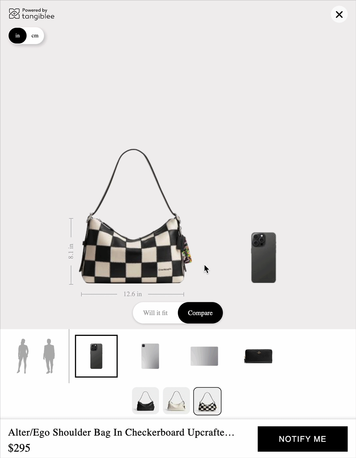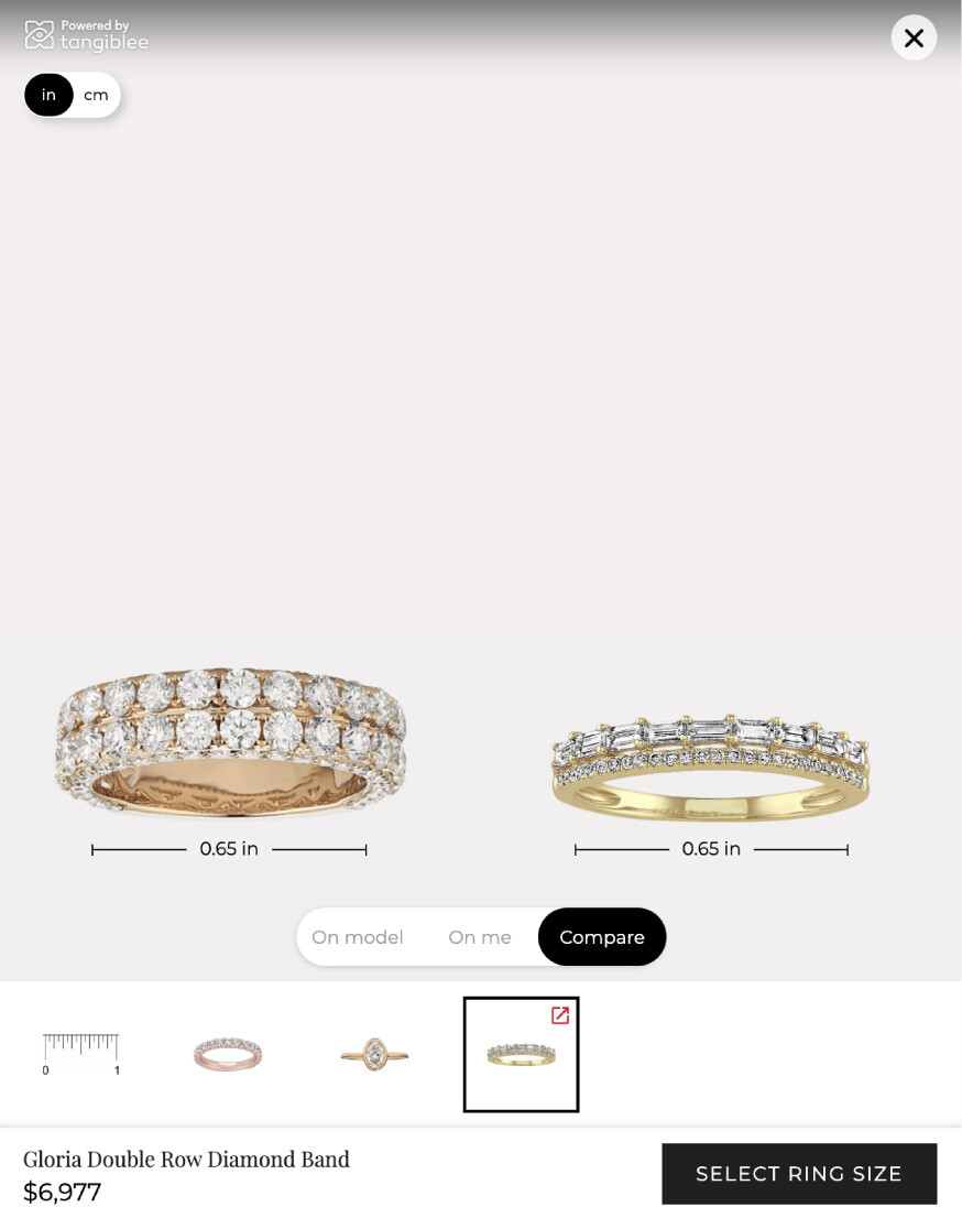 Tangiblee Vergleichsmodus ist ein maßstabsgetreues Vergleichserlebnis für Schmuck, Taschen und Uhren. Es richtet Produkte auf den gleichen Betrachtungswinkel und die gleiche Perspektive aus, sodass Käufer sie bewerten können Größe, Form, Proportionen und Details mit Zuversicht.